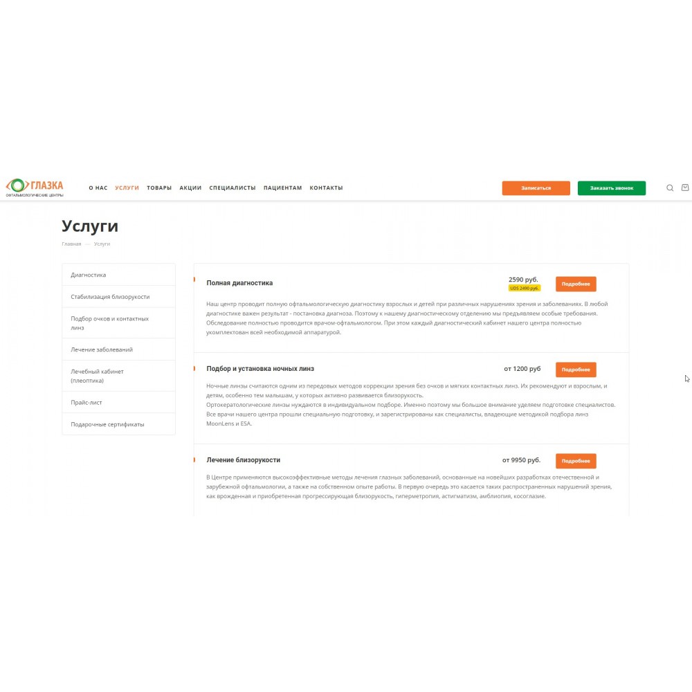 Веб-студия "Максвебсайт" выполнила работы по доработке шаблона сайта клиники офтальмологии "Глазка" (г. Новосибирск). Существующий сайт, включающий каталог статей, каталог специалистов и каталог товаров с модулем интернет-магазина, был модернизирован для повышения удобства использования, улучшения визуальной привлекательности и расширения функциональности.